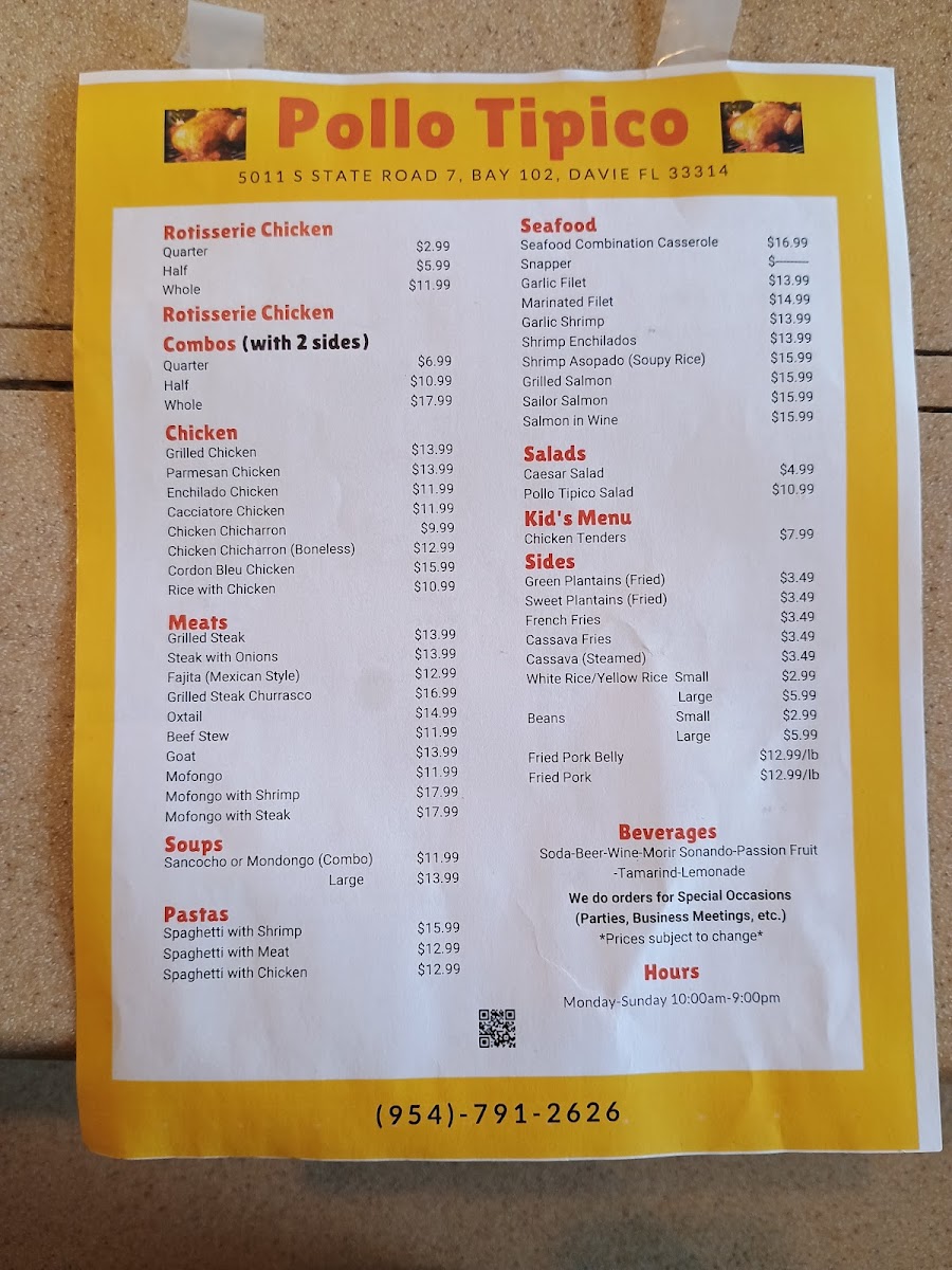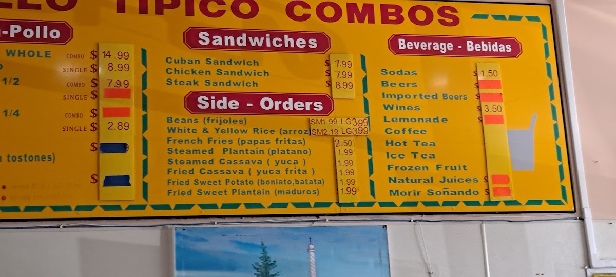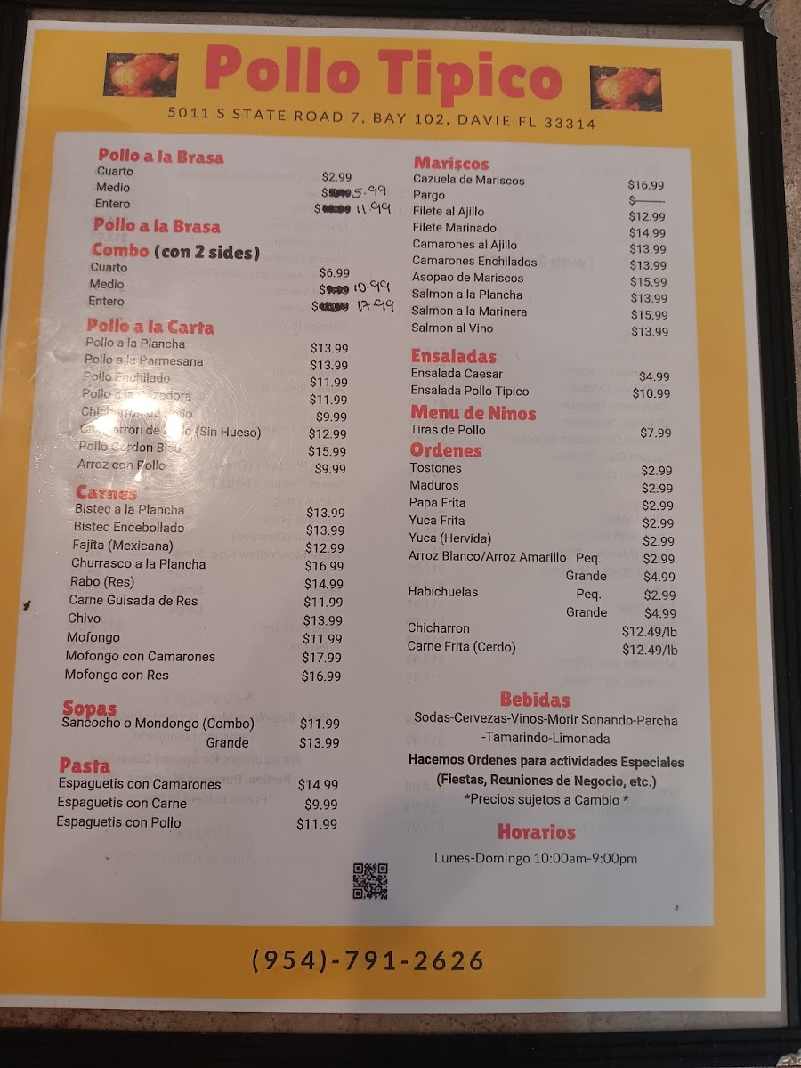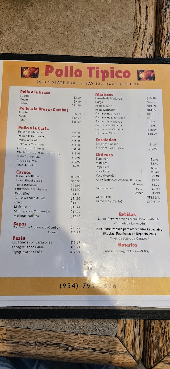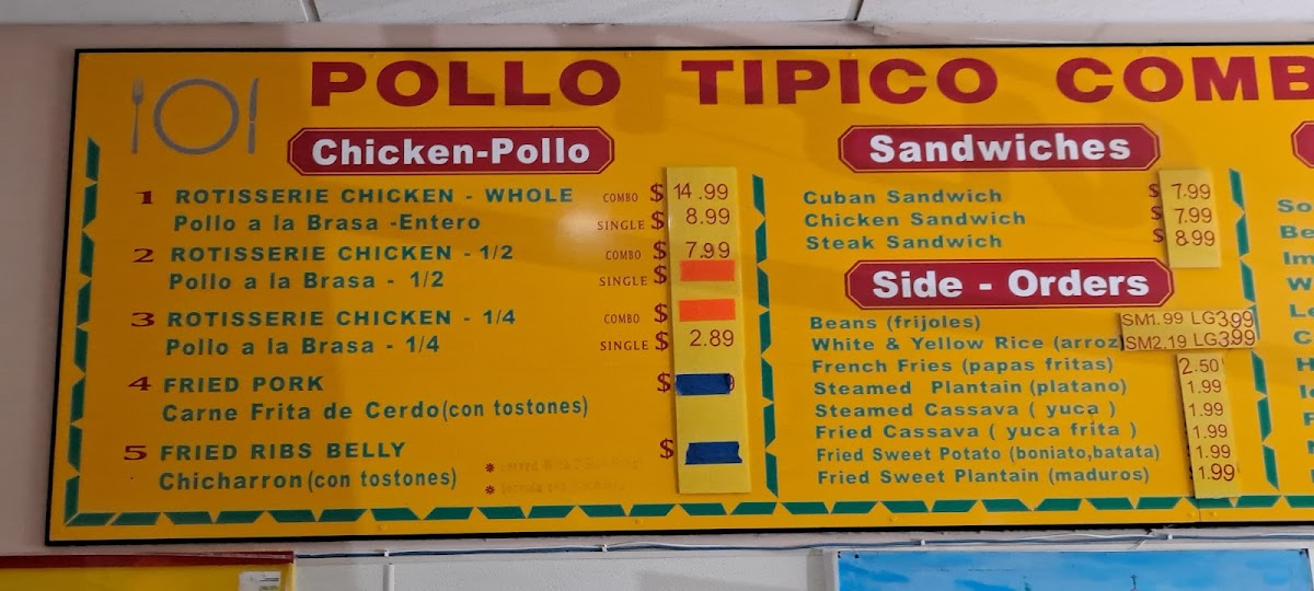 The menu at Pollo Tipico features a variety of Dominican and Latin American dishes, focusing primarily on traditional and fast food offerings. Visitors can expect a selection centered around chicken dishes, including items such as Chicken Chicharron, Chicharron De Pollo, and Half Chicken Dark. In addition to chicken, the menu includes options like Bistec Encebollado (steak with onions), Fried Fish, Pargo Frito (fried snapper), and Rabo Encendido (oxtail stew).