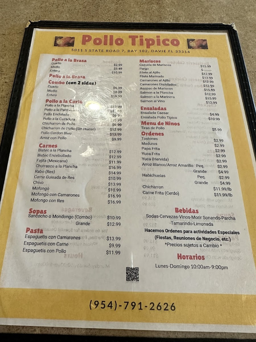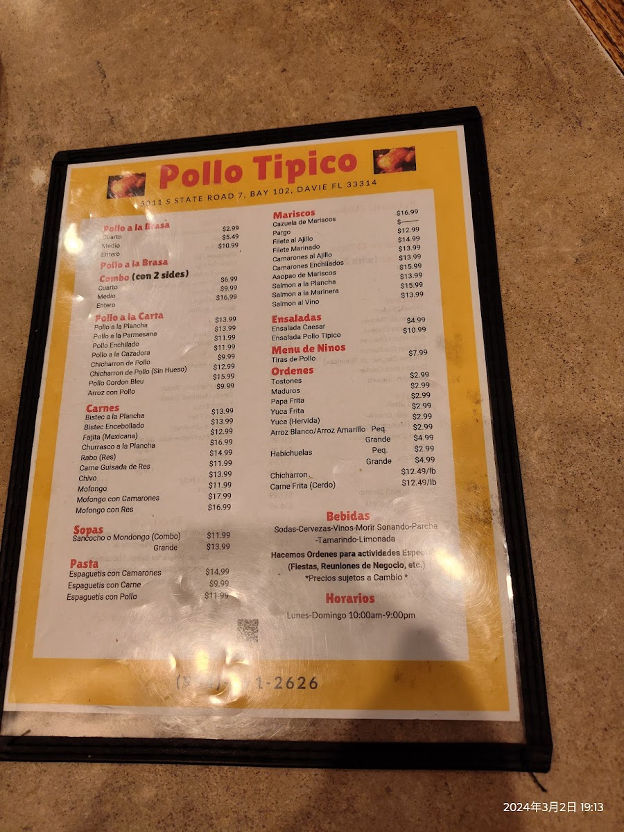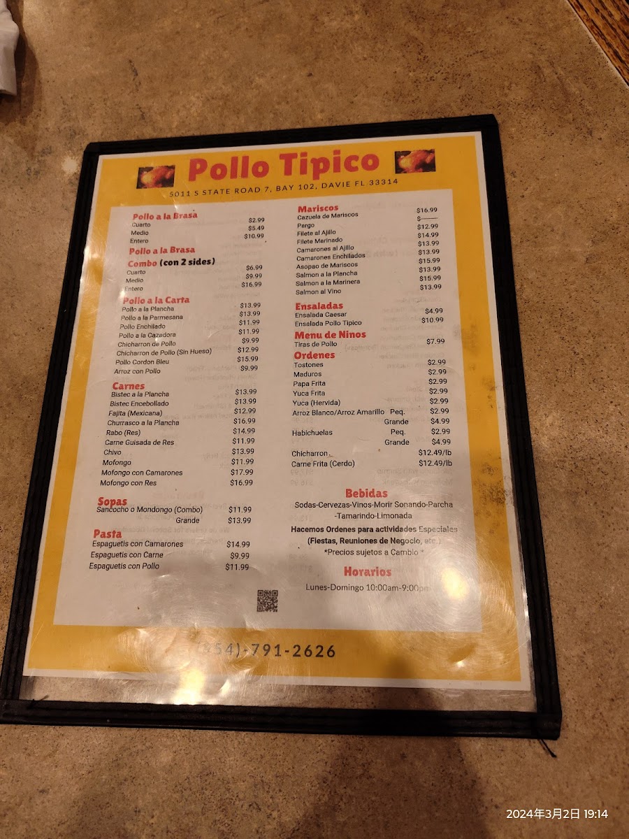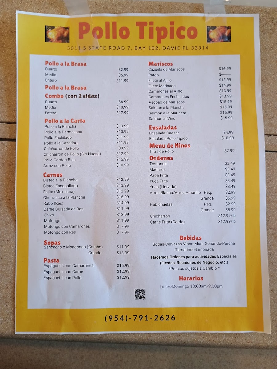 The menu at Pollo Tipico features a variety of Dominican and Latin American dishes, focusing primarily on traditional and fast food offerings. Visitors can expect a selection centered around chicken dishes, including items such as Chicken Chicharron, Chicharron De Pollo, and Half Chicken Dark. In addition to chicken, the menu includes options like Bistec Encebollado (steak with onions), Fried Fish, Pargo Frito (fried snapper), and Rabo Encendido (oxtail stew).